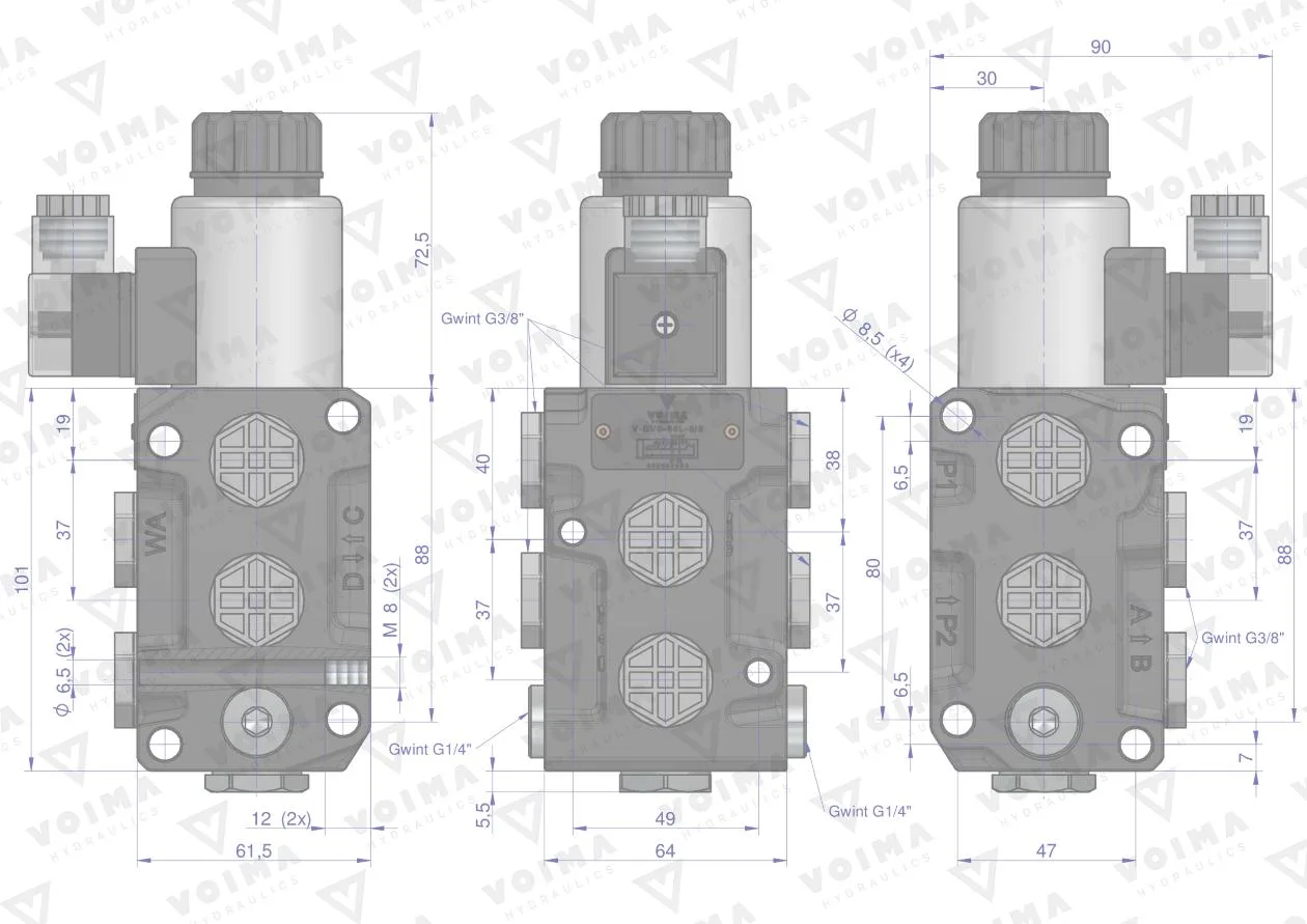 Dzielnik. zawór. elektrozawór kierunkowy elektromagnetyczny kontroli (DVS6/50 L/MIN) 12V DC 6/2 G3/8 50L VOIMA