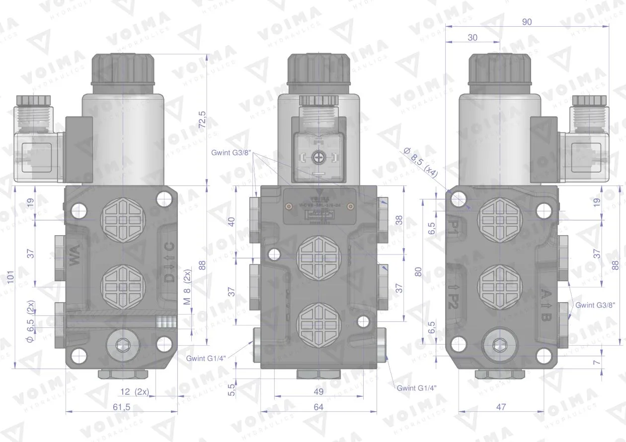 Dzielnik. zawór. elektrozawór kierunkowy elektromagnetyczny kontroli (DVS6/50 L/MIN) (24V DC) 6/2 G3/8 50L VOIMA