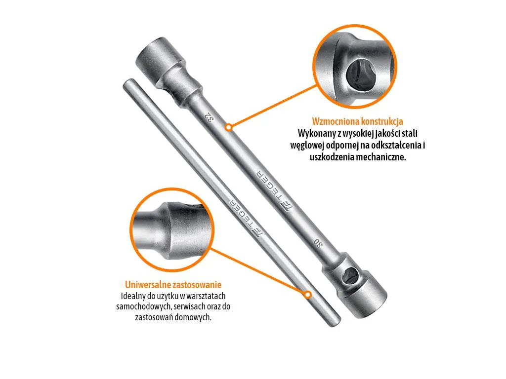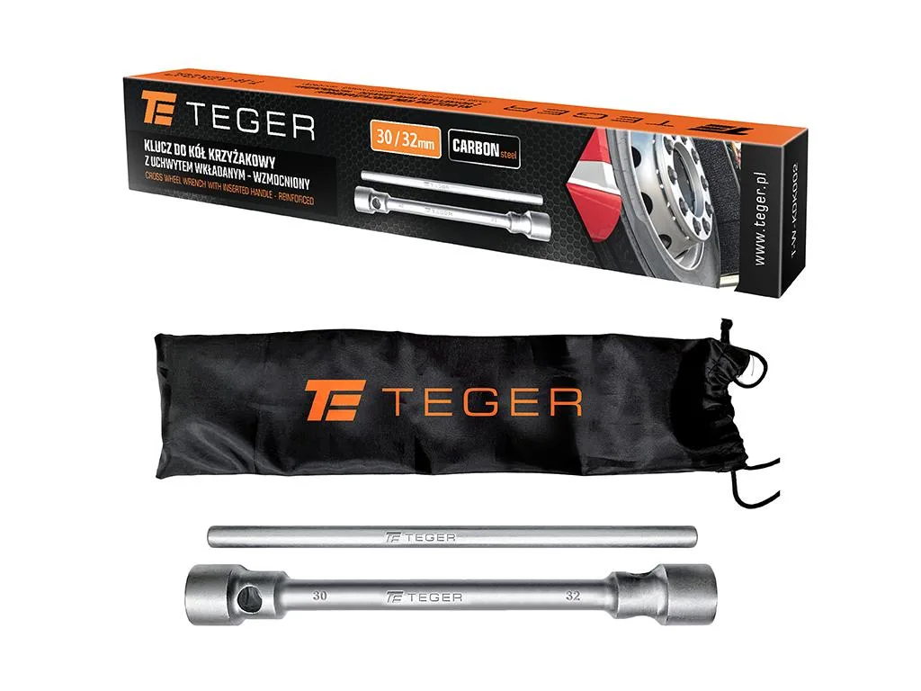Klucz do kół krzyżakowy z uchwytem wkładanym - wzmocniony (30/32mm) / TEGER wysokiej jakości klucz krzyżakowy do kół zaprojektowany z myślą o maksymalnej wytrzymałości i wygodzie użytkowania. Dzięki wzmocnionej konstrukcji oraz wkładanemu uchwytowi, narzędzie gwarantuje niezawodność i komfort pracy przy montażu i demontażu kół w pojazdach ciężarowych, maszynach rolniczych i budowlanych. Cechy produktu: Solidna konstrukcja – wykonana z wysokiej jakości stali węglowej odpornej na odkształcenia i uszkodzenia mechaniczne, Wzmocniony - zapewnia większą trwałość i bezpieczeństwo użytkowania, Uchwyt wkładany – umożliwia łatwe przechowywanie i transport, Uniwersalne zastosowanie – idealny do użytku w warsztatach samochodowych, serwisach oraz do zastosowań domowych.