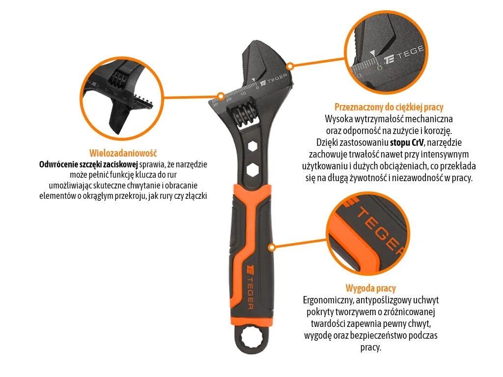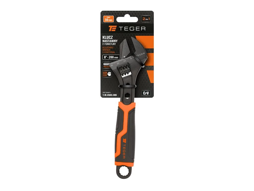 Klucz nastawny 2-funkcyjny 8" 200 mm, TEGER profesjonalny klucz nastawny, przeznaczony do dokręcania, odkręcania i przytrzymywania śrub, nakrętek oraz rur. Wykonany z wysokiej jakości stali chromowo-wanadowej (CrV) charakteryzuje się trwałością i odpornością na ścieranie. Używany do pracy z wysokimi obciążeniami. Posiada precyzyjne pokrętło ślimakowe do płynnej regulacji oraz możliwość odwrócenia szczęki zaciskowej. Dzięki podwójnej funkcjonalności, narzędzie może być wykorzystywane zarówno jako standardowy klucz nastawny, jak i do chwytania rur czy niestandardowych kształtów. Szczególnie przydatny w pracy z takimi elementami, jak nakrętki, śruby, rury, czy zaokrąglone złącza.