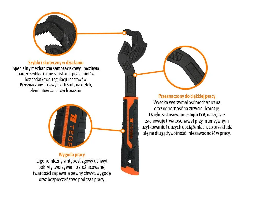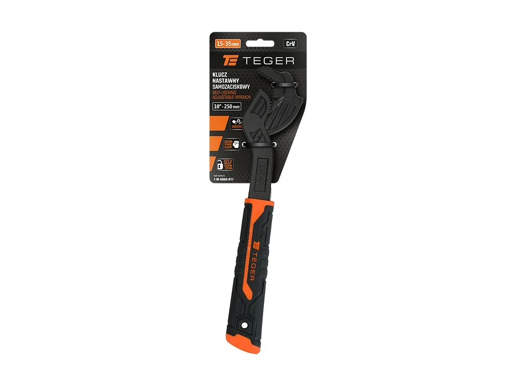 Klucz nastawny samozaciskowy 10" 250 mm, TEGER profesjonalny, uniwersalny klucz nastawny, przeznaczony do wszystkich śrub, nakrętek, elementów walcowych oraz rur. Mechanizm zaciskowy umożliwia bardzo szybkie i silne zaciskanie przedmiotów, użytkownik nie musi ręcznie regulować szczęki, co znacząco ułatwia i przyspiesza pracę. Wykonany z wysokiej jakości stali chromowo-wanadowej (CrV), klucz zapewnia wysoką wytrzymałość, odporność na ścieranie oraz długą żywotność. Specjalnie utwardzone szczęki gwarantują mocny chwyt i stabilność nawet przy intensywnym użytkowaniu.