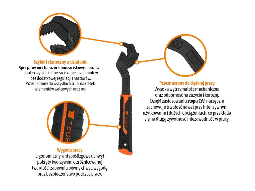 Klucz nastawny samozaciskowy 6" 150 mm, TEGER profesjonalny, uniwersalny klucz nastawny, przeznaczony do wszystkich śrub, nakrętek, elementów walcowych oraz rur. Mechanizm zaciskowy umożliwia bardzo szybkie i silne zaciskanie przedmiotów, użytkownik nie musi ręcznie regulować szczęki, co znacząco ułatwia i przyspiesza pracę. Wykonany z wysokiej jakości stali chromowo-wanadowej (CrV), klucz zapewnia wysoką wytrzymałość, odporność na ścieranie oraz długą żywotność. Specjalnie utwardzone szczęki gwarantują mocny chwyt i stabilność nawet przy intensywnym użytkowaniu.