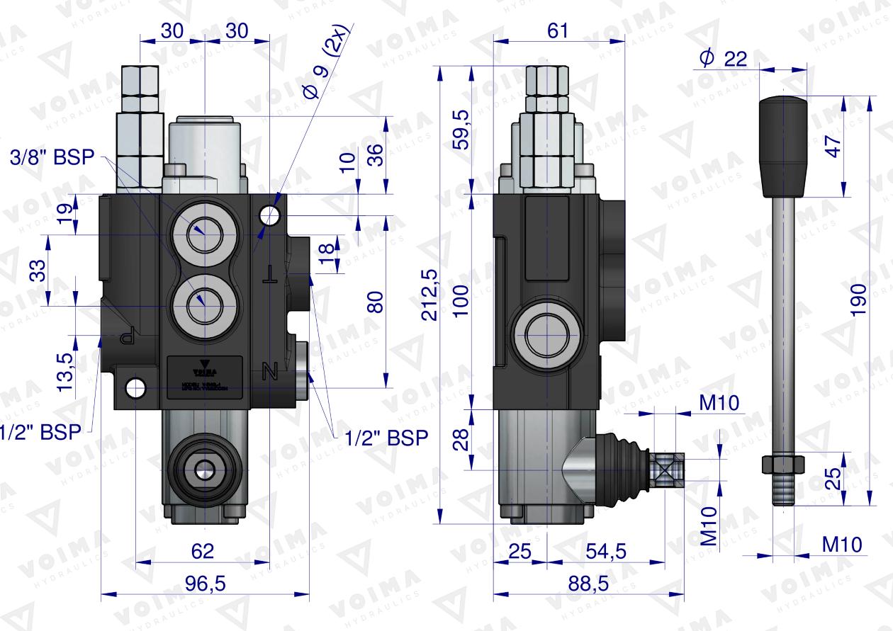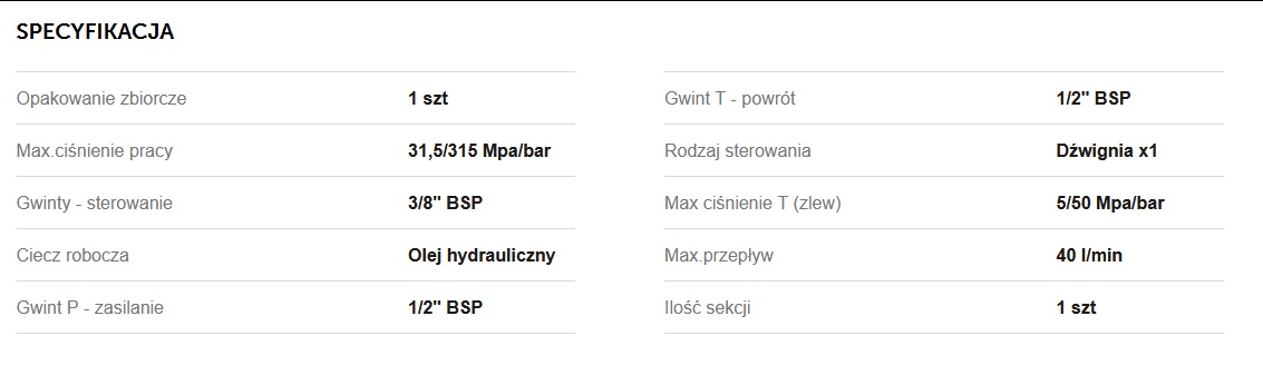 Rozdzielacz hydrauliczny 1-sekcyjny 40L VOIMA - monoblokowy z układem równoległym z neutralną pozycją środkową. Olej w pozycji neutralnej krąży między pompą hydrauliczną a zbiornikiem.