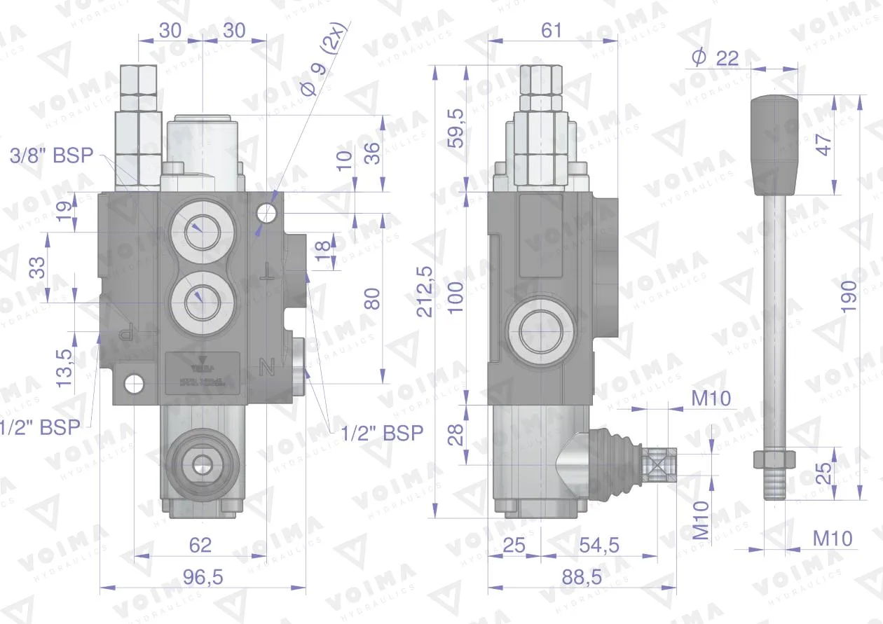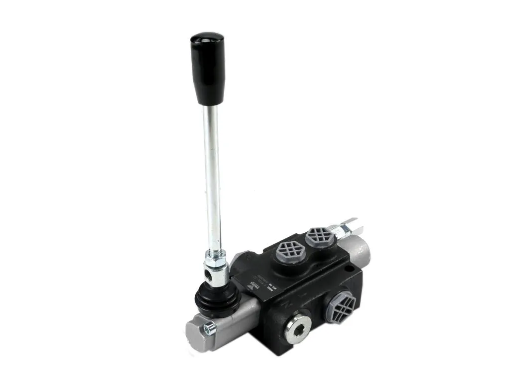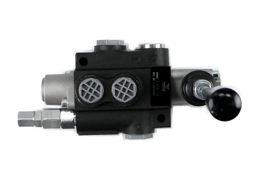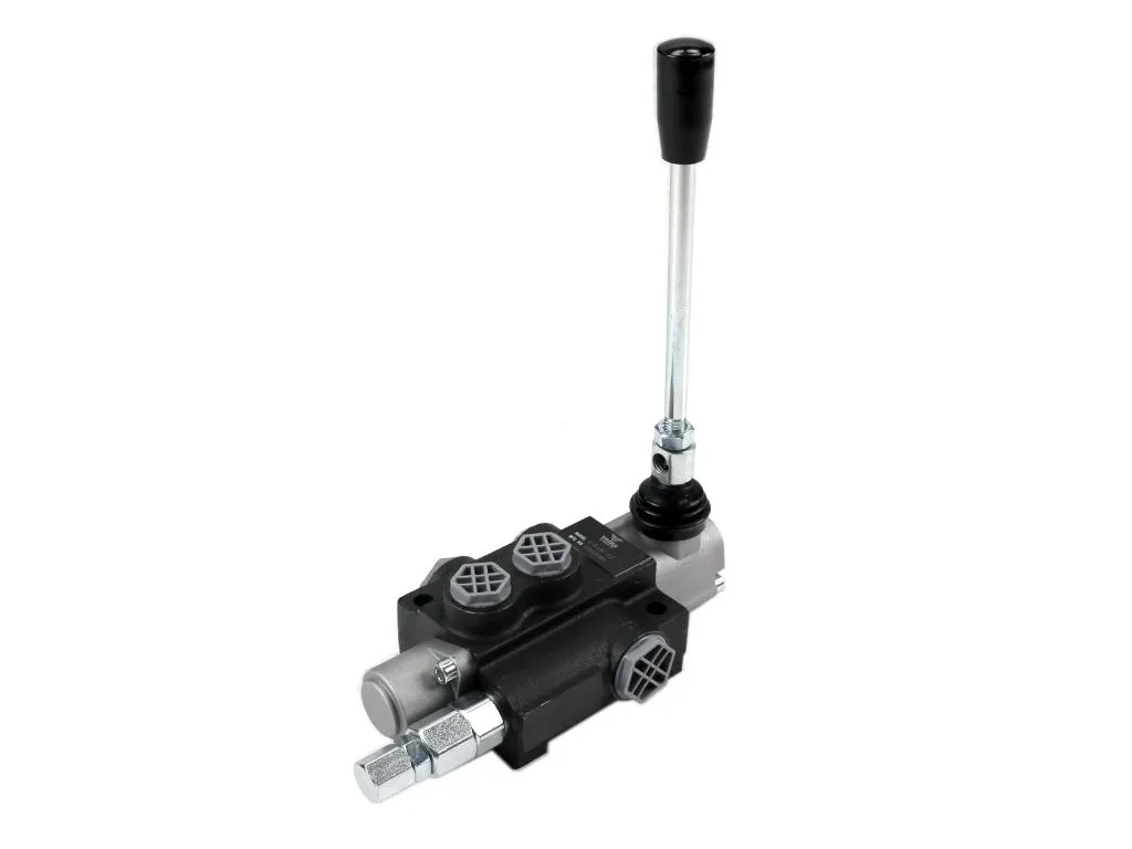 Rozdzielacz hydrauliczny 1-sekcyjny 40L z zatrzaskiem VOIMA - monoblokowy z układem równoległym z neutralną pozycją środkową. Olej w pozycji neutralnej krąży między pompą hydrauliczną a zbiornikiem.