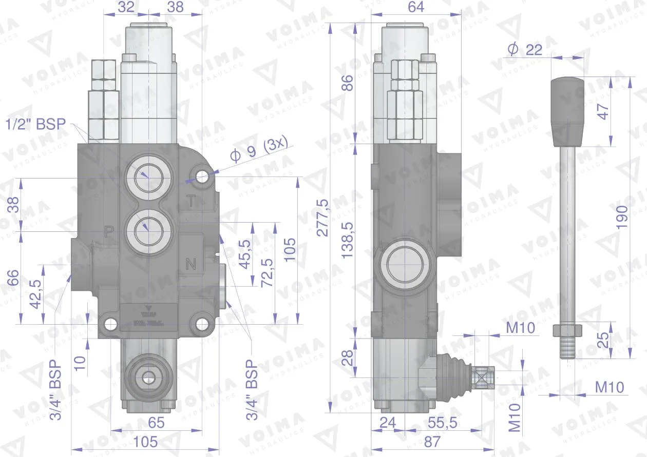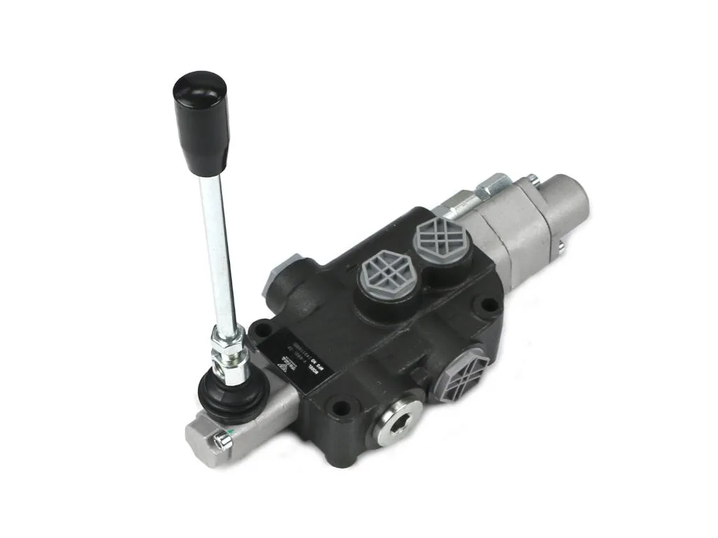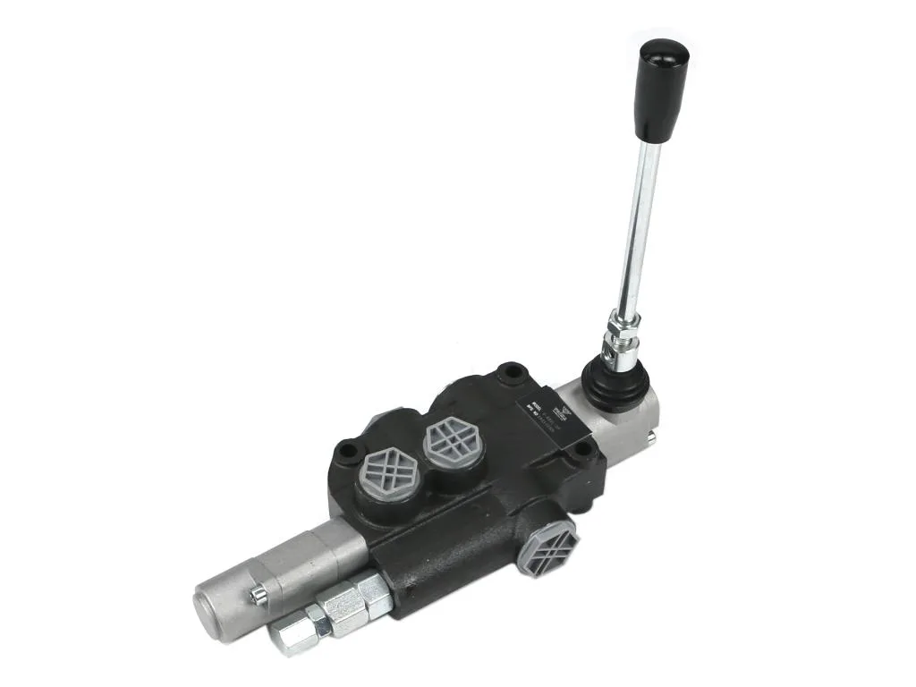Rozdzielacz hydrauliczny 1-sekcyjny 80L z sekcją pływającą VOIMA - monoblokowy z układem równoległym z neutralną pozycją środkową. Olej w pozycji neutralnej krąży między pompą hydrauliczną a zbiornikiem. Sekcja: pływająca (z zatrzaskiem).
