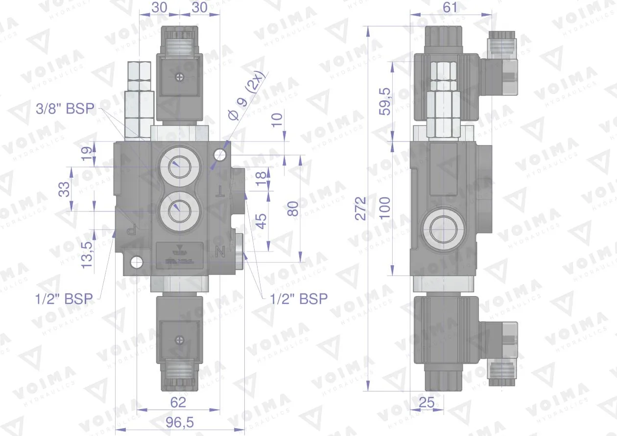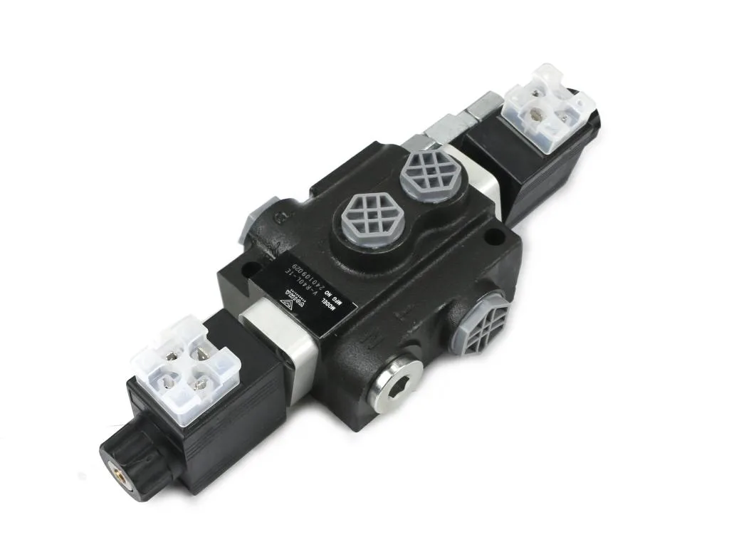 Rozdzielacz hydrauliczny 1-sekcyjny sterowany elektrycznie 12V 40L VOIMA - monoblokowy z układem równoległym z neutralną pozycją środkową. Olej w pozycji neutralnej krąży między pompą hydrauliczną a zbiornikiem.