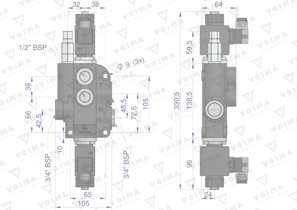 Rozdzielacz hydrauliczny 1-sekcyjny sterowany elektrycznie 12V 80L VOIMA - monoblokowy z układem równoległym z neutralną pozycją środkową. Olej w pozycji neutralnej krąży między pompą hydrauliczną a zbiornikiem.