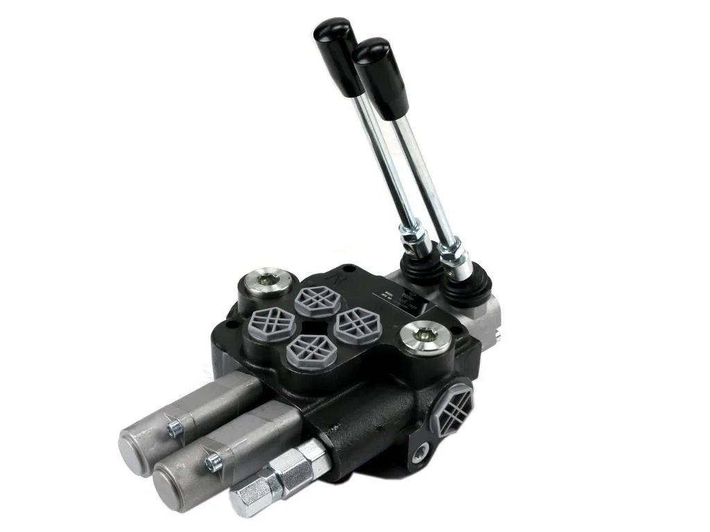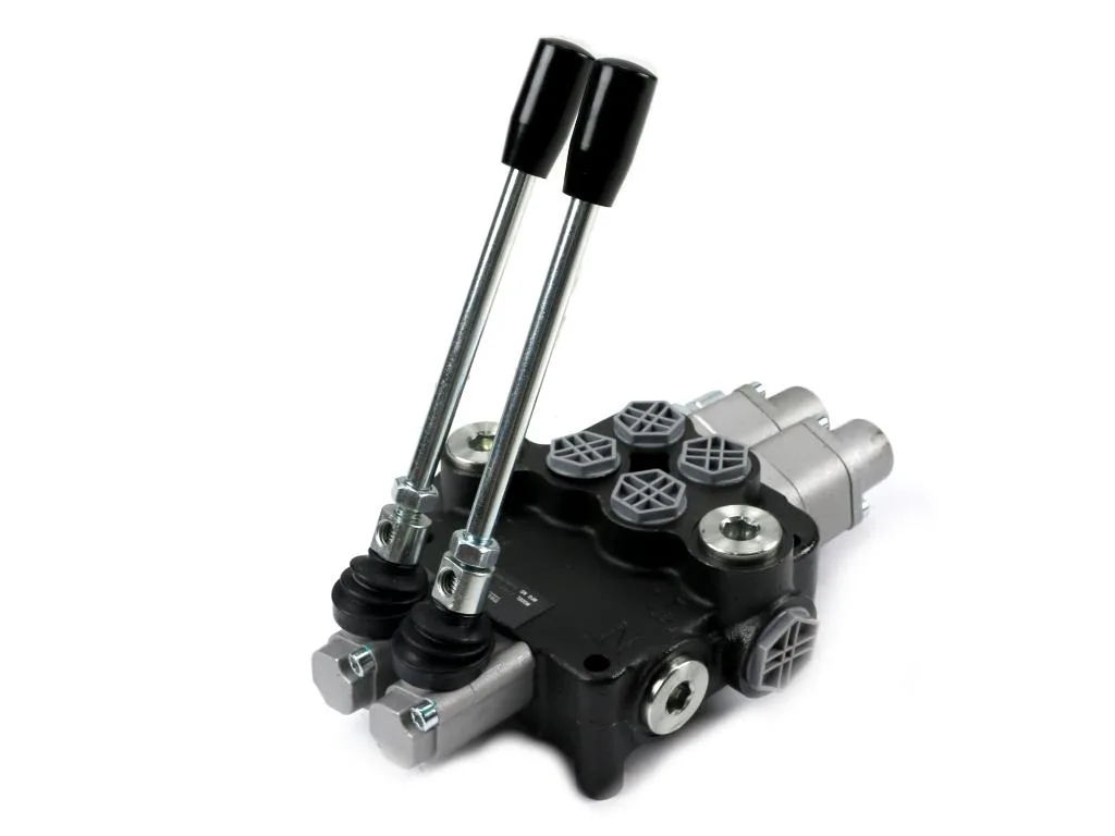 Rozdzielacz hydrauliczny 2-sekcyjny 80L (2 sekcje - pływające) VOIMA - monoblokowy z układem równoległym z neutralną pozycją środkową. Olej w pozycji neutralnej krąży między pompą hydrauliczną a zbiornikiem. Sekcje pływające (z zatrzaskiem).