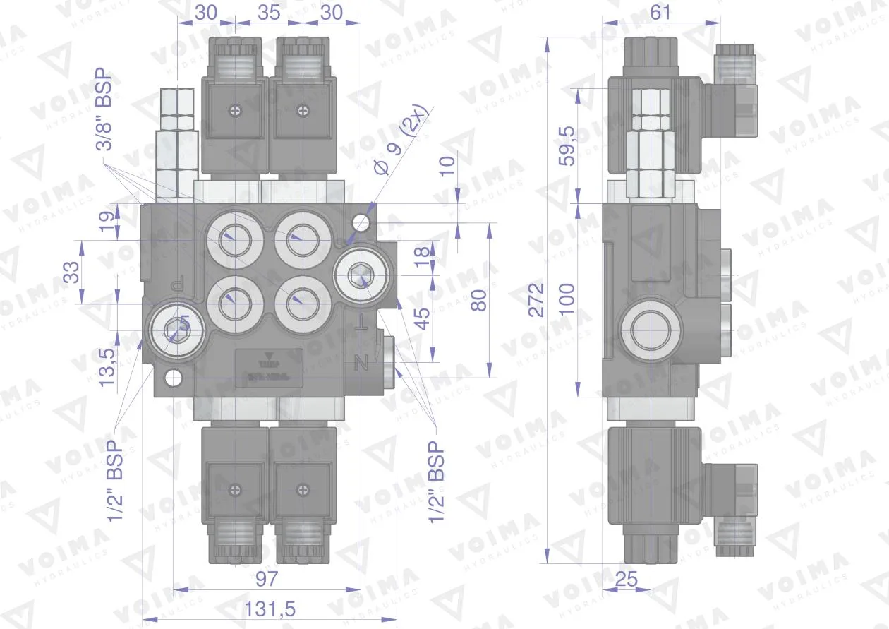 Rozdzielacz hydrauliczny 2-sekcyjny sterowany elektrycznie 12V 40L VOIMA - monoblokowy z układem równoległym z neutralną pozycją środkową. Olej w pozycji neutralnej krąży między pompą hydrauliczną a zbiornikiem.