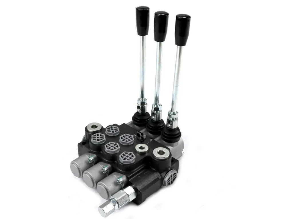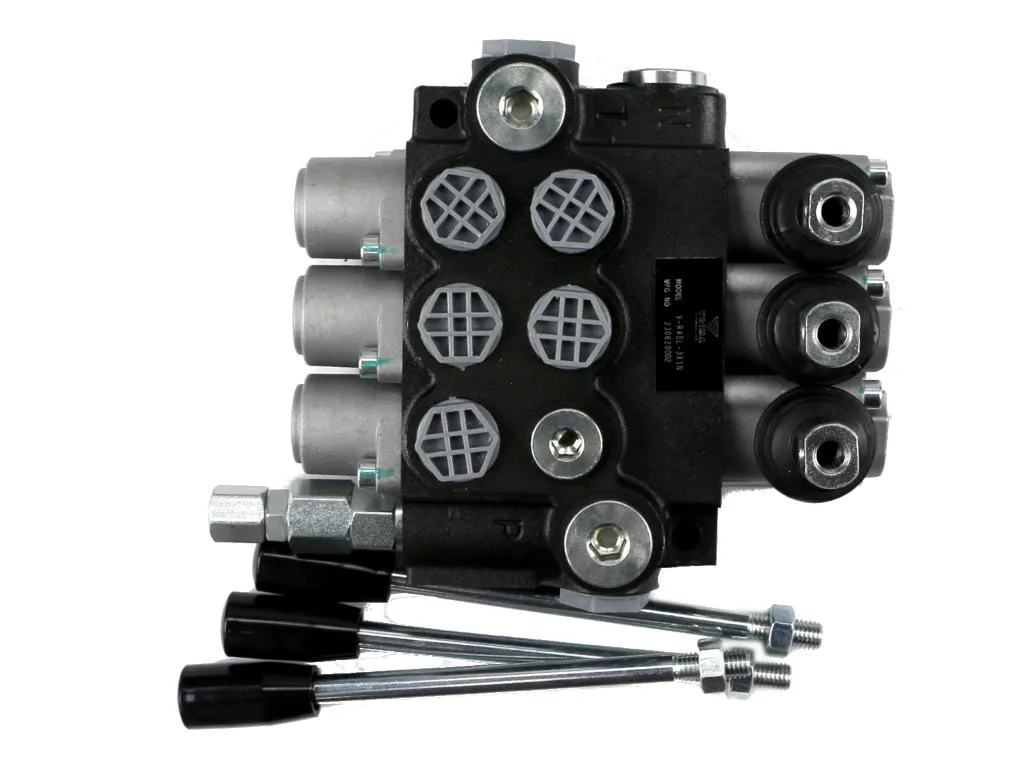 Rozdzielacz hydrauliczny 3-sekcyjny 40L (1-sekcja nurnikowa) VOIMA - monoblokowy z układem równoległym z neutralną pozycją środkową. Olej w pozycji neutralnej krąży między pompą hydrauliczną a zbiornikiem.