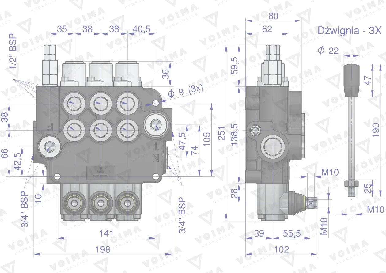 Rozdzielacz hydrauliczny 3-sekcyjny 80L z zatrzaskami VOIMA