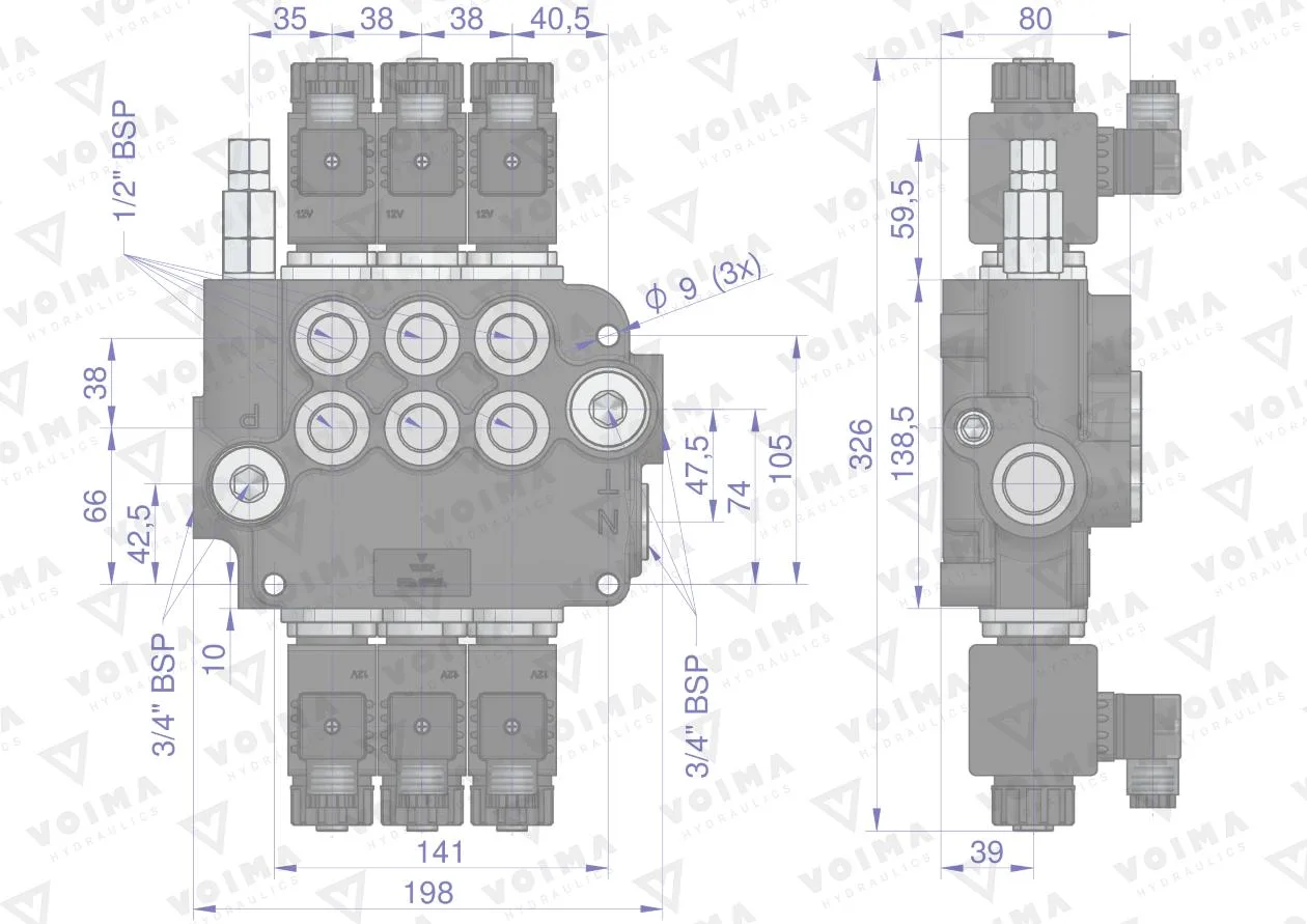Rozdzielacz hydrauliczny 3-sekcyjny sterowany elektrycznie 12V 80L VOIMA - monoblokowy z układem równoległym z neutralną pozycją środkową. Olej w pozycji neutralnej krąży między pompą hydrauliczną a zbiornikiem.