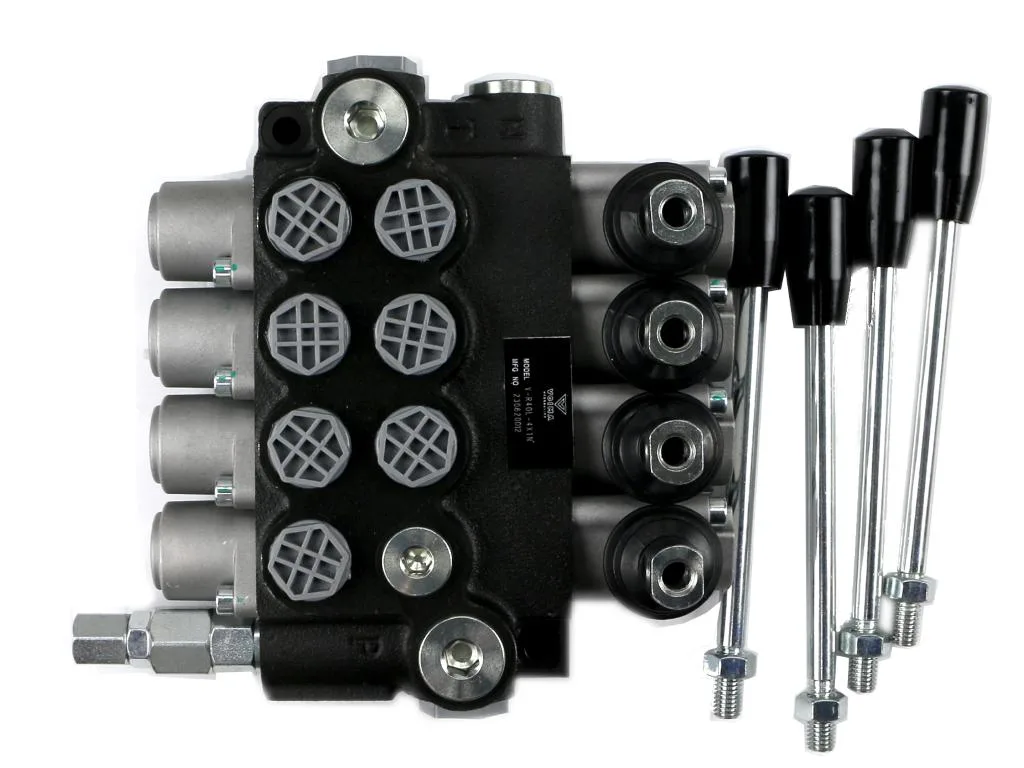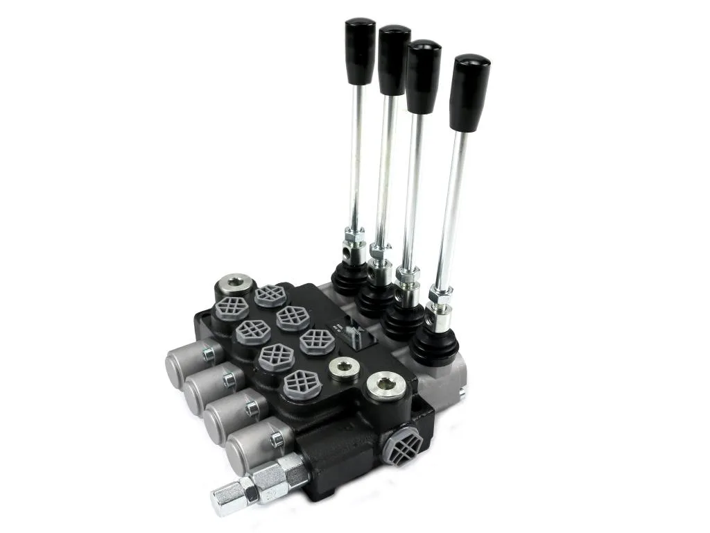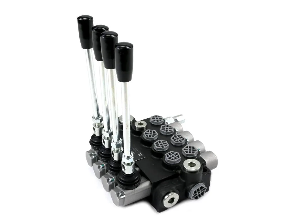 Rozdzielacz hydrauliczny 4-sekcyjny 40L (1-sekcja nurnikowa) VOIMA - monoblokowy z układem równoległym z neutralną pozycją środkową. Olej w pozycji neutralnej krąży między pompą hydrauliczną a zbiornikiem.