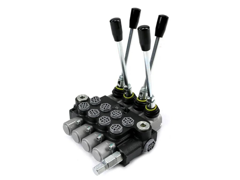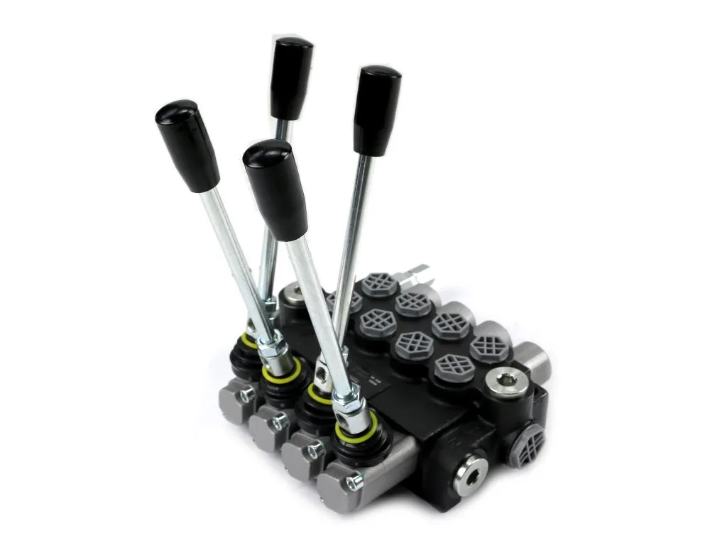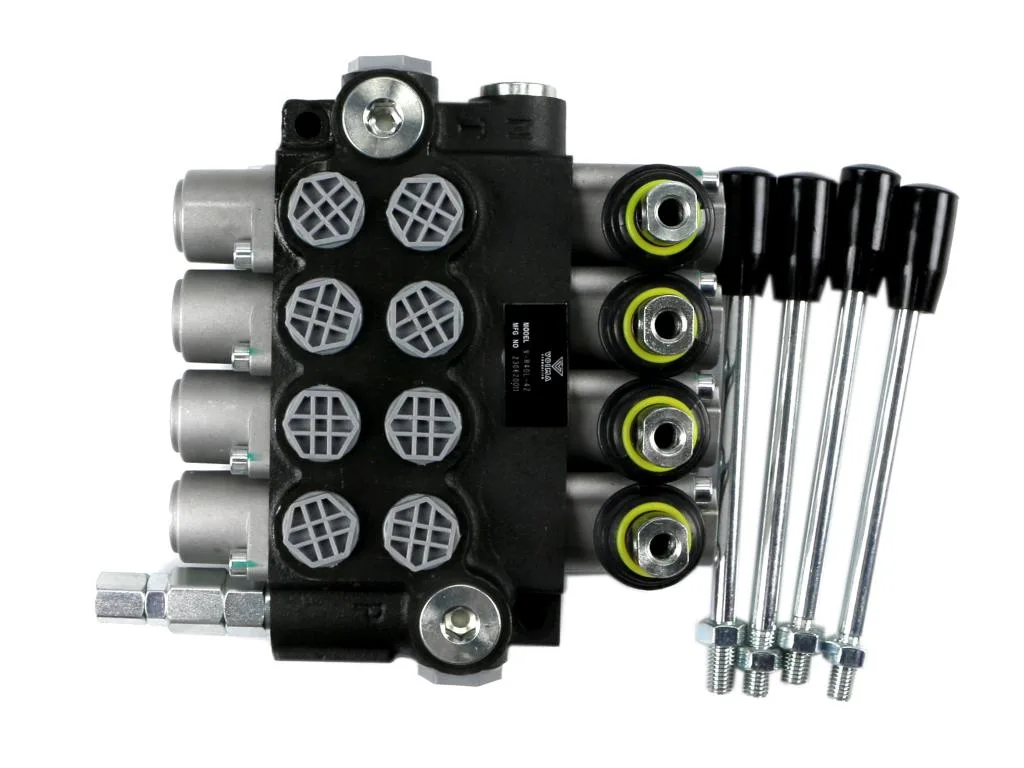 Rozdzielacz hydrauliczny 4-sekcyjny 40L z zatrzaskami na 4 sekcjach VOIMA - monoblokowy z układem równoległym z neutralną pozycją środkową. Olej w pozycji neutralnej krąży między pompą hydrauliczną a zbiornikiem.