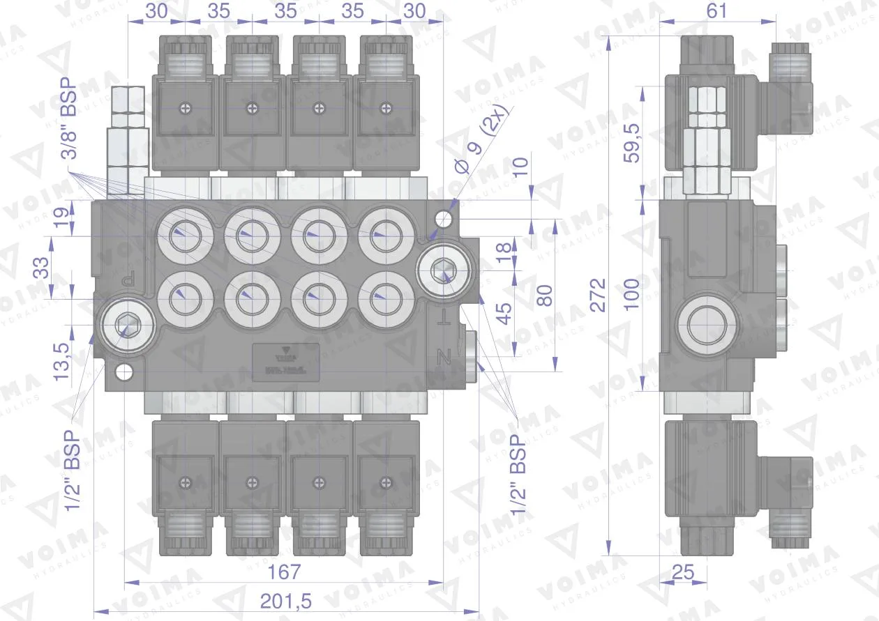 Rozdzielacz hydrauliczny 4-sekcyjny sterowany elektrycznie 12V 40L VOIMA - monoblokowy z układem równoległym z neutralną pozycją środkową. Olej w pozycji neutralnej krąży między pompą hydrauliczną a zbiornikiem.