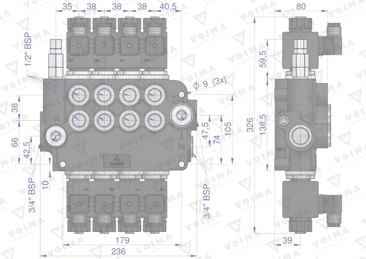 Rozdzielacz hydrauliczny 4-sekcyjny sterowany elektrycznie 12V 80L VOIMA - monoblokowy z układem równoległym z neutralną pozycją środkową. Olej w pozycji neutralnej krąży między pompą hydrauliczną a zbiornikiem.