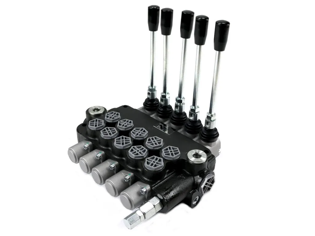 Rozdzielacz hydrauliczny 5-sekcyjny 80L VOIMA - monoblokowy z układem równoległym z neutralną pozycją środkową. Olej w pozycji neutralnej krąży między pompą hydrauliczną a zbiornikiem.