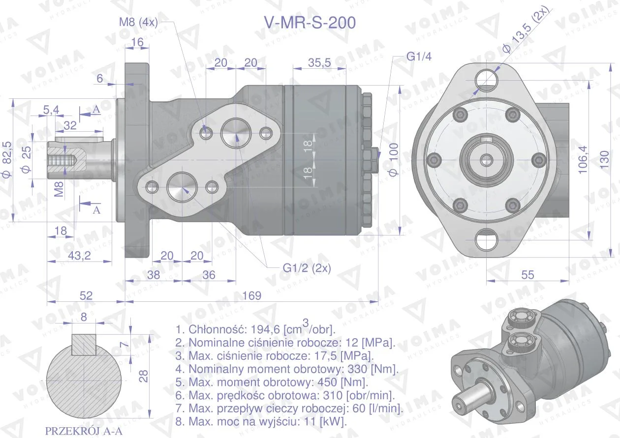 Silnik hydrauliczny orbitalny (stosowany do owijarek) V-MR-S 200 cm3/obr (175 bar / max.200 bar) VOIMA - 17,5 MPa/175 bar - uwaga: maksymalne ciągłe ciśnienie pracy silnika). Silniki serii V-MR mają lekką kompaktową konstrukcję, wysoki moment obrotowy. Możliwość połączenia równolegle lub szeregowo. W celu osiągnięcia dłuższej żywotności zaleca się, aby optymalne warunki pracy były na poziomie 1/3 do 2/3 parametrów maksymalnych.