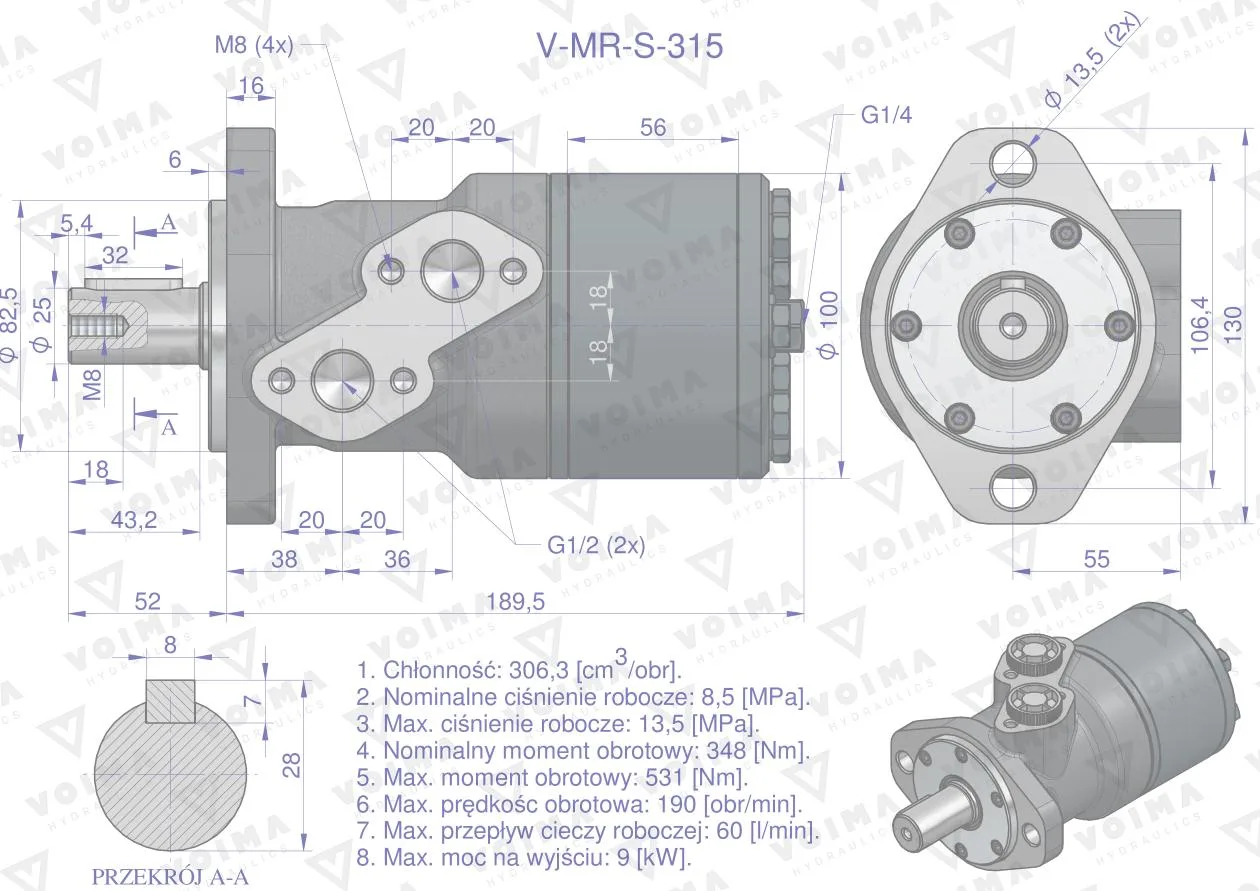 Silnik hydrauliczny orbitalny V-MR-S 315 cm3/obr (135 bar / max.175 bar) VOIMA - 13,5 MPa/135 bar - uwaga: maksymalne ciągłe ciśnienie pracy silnika). Silniki serii V-MR mają lekką kompaktową konstrukcję, wysoki moment obrotowy. Możliwość połączenia równolegle lub szeregowo. W celu osiągnięcia dłuższej żywotności zaleca się, aby optymalne warunki pracy były na poziomie 1/3 do 2/3 parametrów maksymalnych.