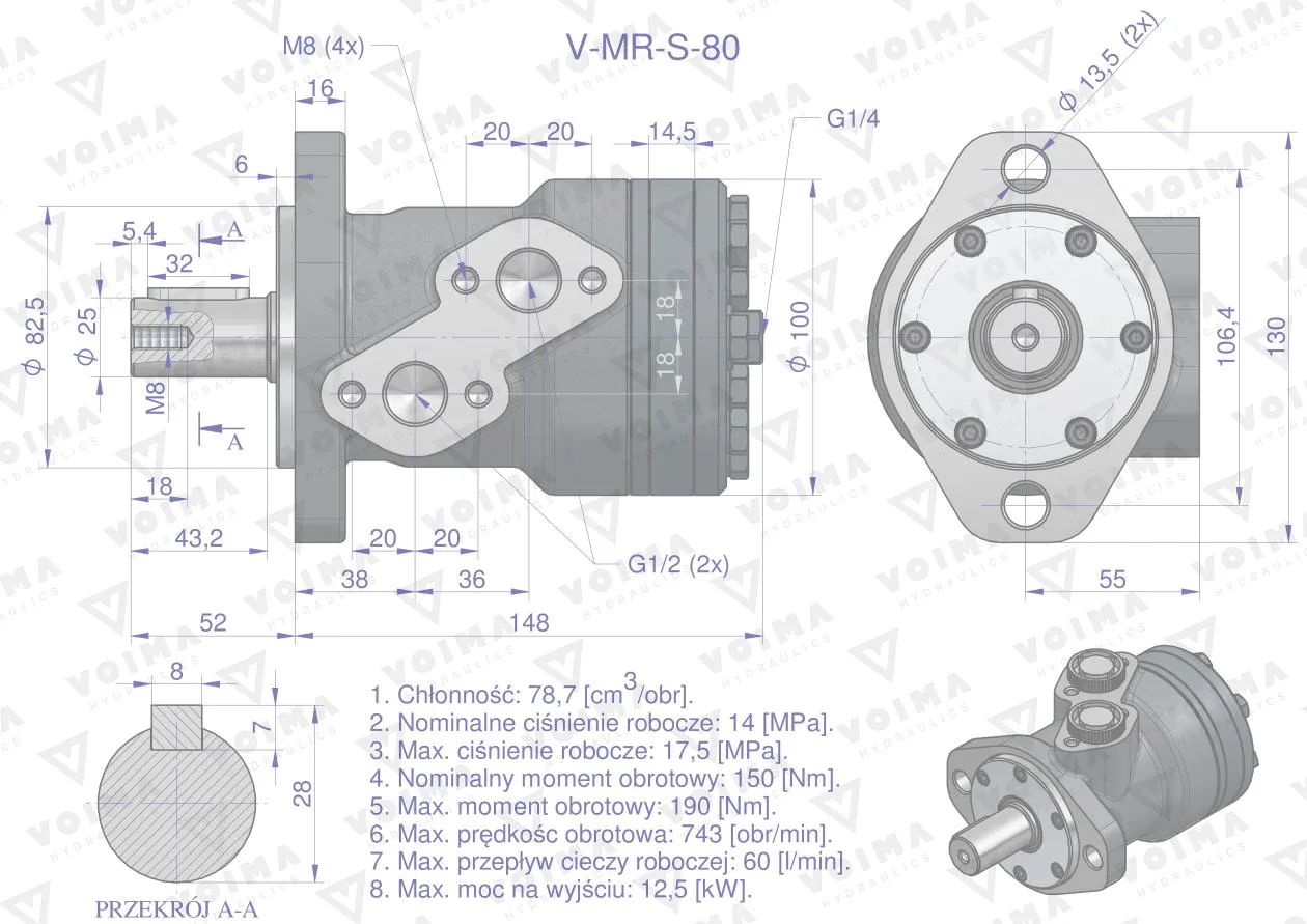 Silnik hydrauliczny orbitalny V-MR-S 80 cm3/obr (175 bar / max.200 bar) VOIMA - 17,5 MPa/175 bar - uwaga: maksymalne ciągłe ciśnienie pracy silnika). Silniki serii V-MR mają lekką kompaktową konstrukcję, wysoki moment obrotowy. Możliwość połączenia równolegle lub szeregowo. W celu osiągnięcia dłuższej żywotności zaleca się, aby optymalne warunki pracy były na poziomie 1/3 do 2/3 parametrów maksymalnych.
