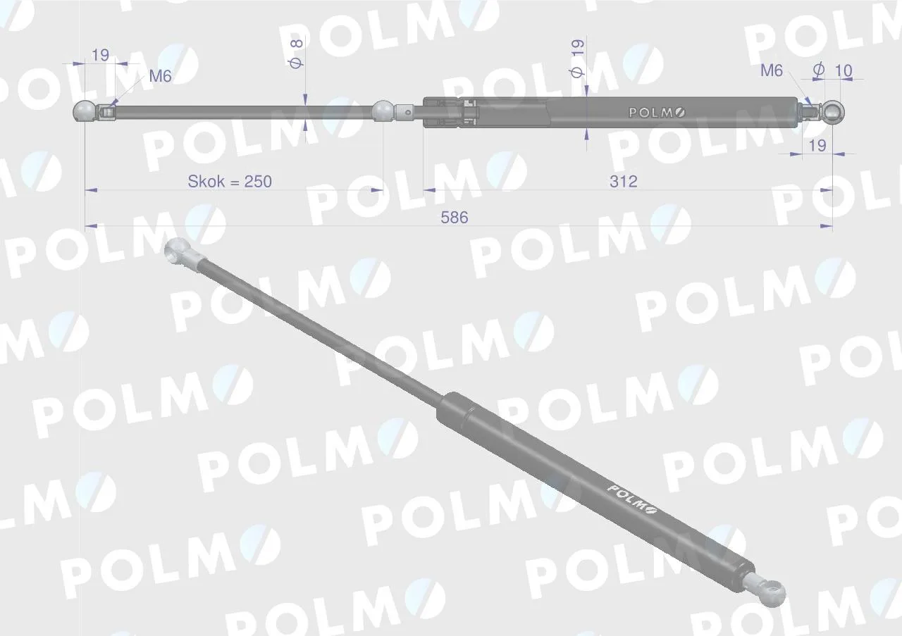 Siłownik szyby tylnej L max. 586mm 82001505P CASE IH POLMO